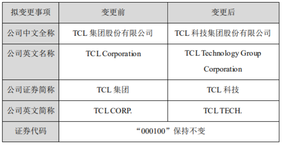 速途网讯 今日,TCL集团发布公告,拟将名称变更为“TCL科技集团股份有限公司”,英文名称相应变更为“TCL Technology Group Corporation”,将证券简称变更为“TCL科技”,英文简称变更为“TCL TECH.”,证券代码仍为“000100”。