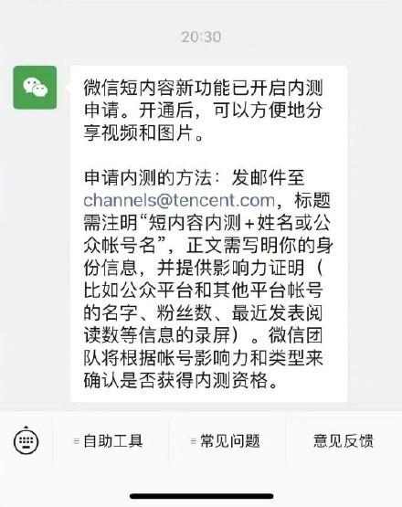 速途网讯 日前,微信官方表示,微信短内容新功能已开启内测申请。开通后,可以方便地分享视频和图片。申请内测的方法为发邮件至channels@tencent.com,标题注明“短内容内测+姓名或公众账号名”,正文需写明身份信息并提供影响力证明,微信团队将根据账号影响力和类型来确认是否获得内测资格。