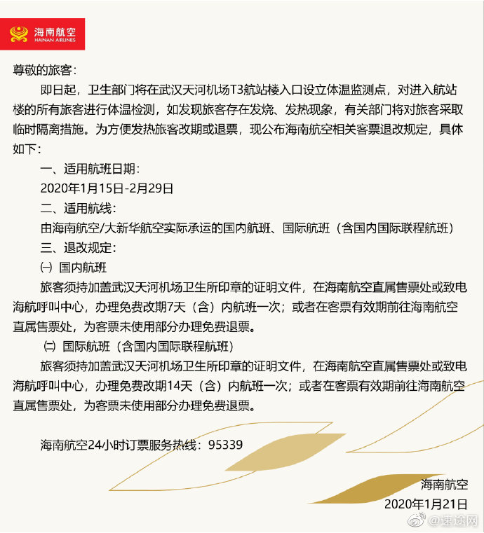 同时,武汉天河机场运行协调管理委员会向各航空公司发函,请各航司为持有加盖武汉天河机场卫生所印章证明文件的旅客免费办理退票与改签业务。