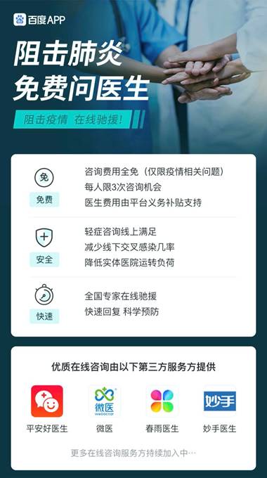 用户只需在百度App搜索“问医生”,进入咨询页面点击免费咨询,在所咨询的问题里加上“肺炎”两字,就可以获得免费咨询的机会。据了解,为提高服务质量和稳定性,百度App此次接入了平安好医生、微医、春雨医生、妙手医生等多家优质合作伙伴,以为用户提供更加专业、优质的服务。