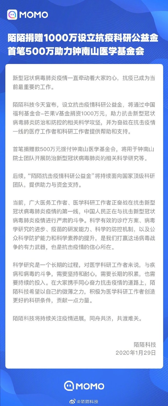 陌陌捐赠1000万元设立抗疫科研公益金 佳馨 • 2020年1月29日 21:51 • 元宇宙, 公益, 快讯 速途网讯 今日,移动社交平台陌陌宣布,设立抗击疫情科研公益金,将通过中国福利基金会-芒果V基金捐资1000万元,助力抗击新型冠状病毒肺炎防治和防控的相关科学攻坚,并为奋战在抗击疫情一线的医疗工作者和科研工作者提供帮助和支持。(吴佳馨) 赞 (0) 佳馨 0 生成海报 捐赠2000万元物资 搜狗及搜狐集团支持抗击疫情工作 上一篇 2020年1月29日 21:46 新浪设立1亿元抗击肺炎专项基金 下一篇 2020年1月29日 21:55