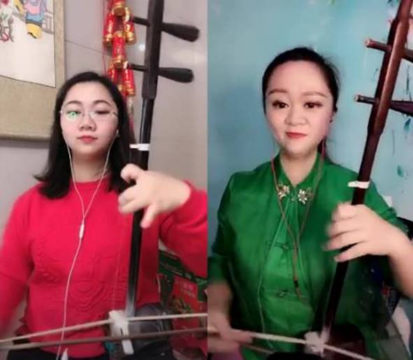 而姐妹间的互动也透着浓浓的亲情味儿,姐姐阿珊调侃“咱俩今天一个穿红一个穿绿,好像红辣椒和青辣椒啊”,而在面对快手老铁“你妹是跟你学的二胡吗”的提问时,妹妹阿静调皮抢答“是她跟我学的……才怪”,姐姐阿珊一脸“真拿你没办法”的宠溺笑容看着屏幕中的妹妹,之后才解释其实两人小时候有在一起学习过。