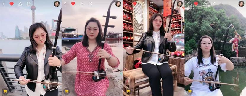 在阿静的作品中还有一个非常吸引人的地方,她总是能将音乐与场景相融合,寓情于景。在上海的外滩拉上一曲《上海滩》,在水畔来一曲《湖边晚霞》,在女儿红酒铺里来上一曲《九九女儿红》,在水帘洞前来一曲《西游记》主题曲《敢问路在何方》,在西湖边来一曲《新白娘子传奇》经典曲目……