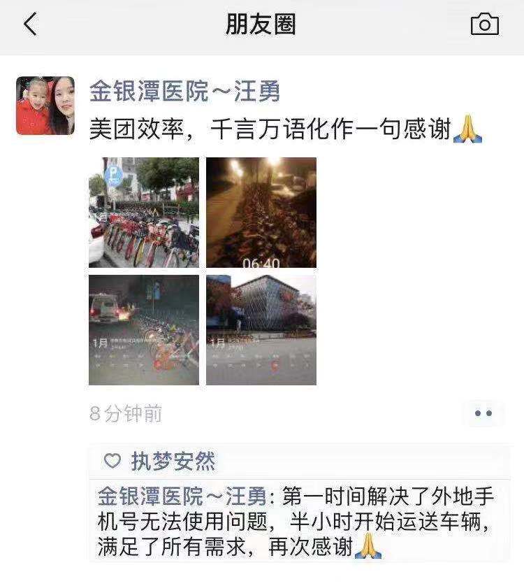 速途网讯 1月30日上午,当一排美团单车整齐停放在武汉市金银潭医院周边,金银潭医院负责救援队出行的工作人员汪女士发了一条朋友圈,写道:“第一时间解决问题,半小时开始运送车辆,满足了所有需求,千言万语化作一句感谢。”