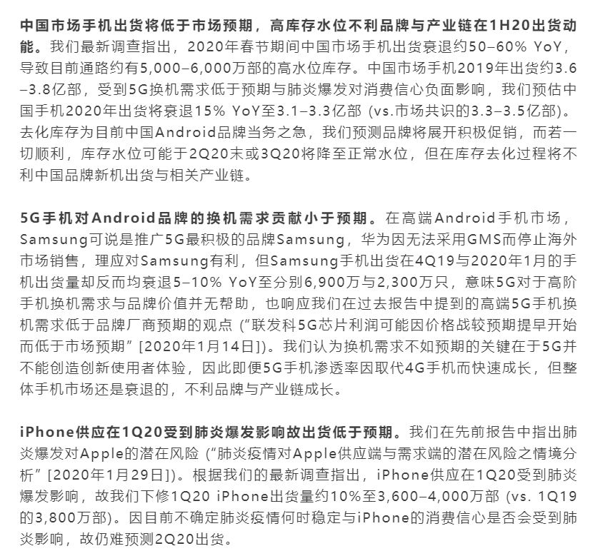速途网讯 昨日,天风国际旗下分析师郭明錤发布最新报告称,2020年第一季度手机行业存在不小的挑战,比如苹果已经将本季度的iPhone出货量下调了10%(至少是百万部)。报告指出,2020年第一季度的手机行业,手机品牌与产业链正面临3个潜在风险:1.中国市场手机出货将低于市场预期;2.5G手机对Android品牌换机需求贡献小于预期;3.iPhone供应在1Q20受到疫情爆发影响故出货低于预期。