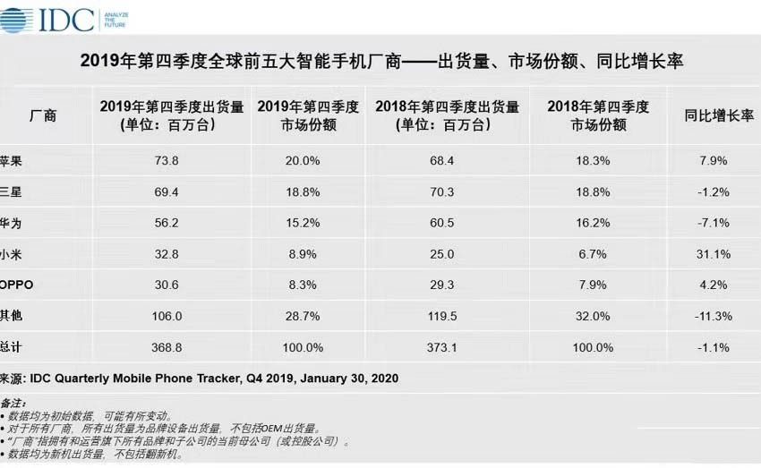 2019年全年,全球前五大智能手机厂商分别为:三星(21.6%)、华为(17.6%)、苹果(13.9%)、小米(9.2%)、OPPO(8.3%)。