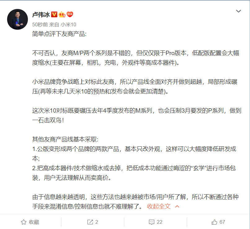 速途网2月10日消息(报道:乔志斌)今日,小米集团副总裁、Redmi品牌负责人卢伟冰在微博点评华为Mate/P系列手机。他表示友商M/P两个系列是不错的,但仅仅限于Pro版本,低配版配置会大幅度缩水。