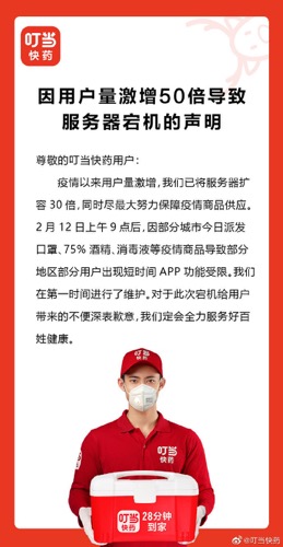 速途网2月12日消息(报道:吴佳馨)今日,叮当快药官方微博发布因用户量激增50倍导致服务器宕机的声明。