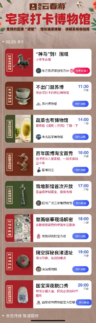 看博物馆直播也算春游?今天的《淘宝经济暖报》给大家推荐了当前最流行的“旅游方式”:云春游。2月23日,国内8大知名博物馆就集体上淘宝直播,在线开馆,迎接八方游客“云春游”。