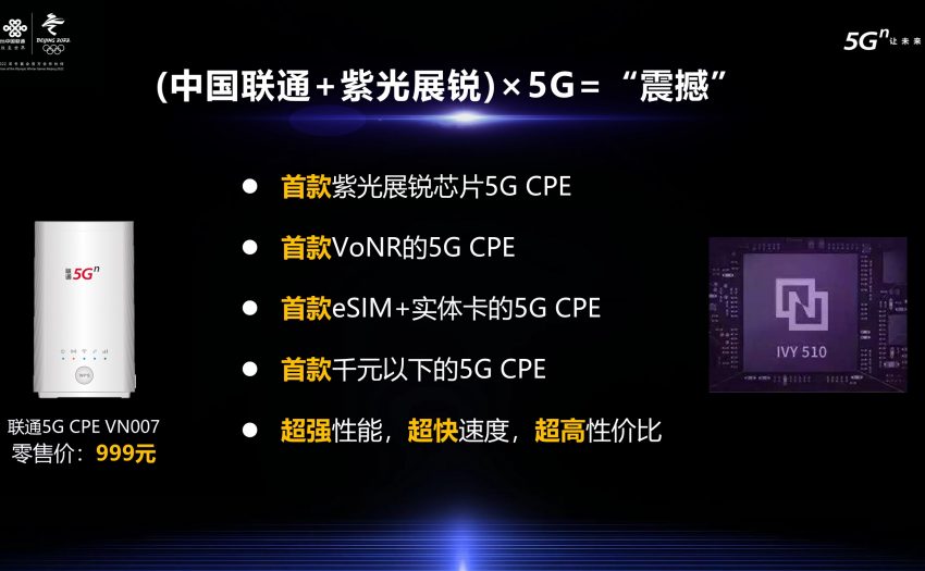 此外,紫光展锐还展示了搭载春藤V510的全球首款VoNR 以及eSIM和实体卡双支持的5G CPE——联通5G CPE。