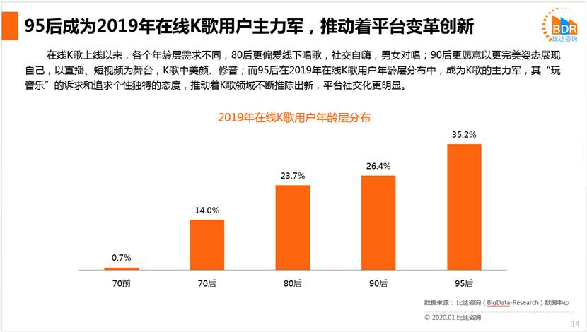 报告还指出,年龄的差异使得不同年龄段用户对K歌的需求各有偏重。80后更偏爱线下唱歌,社交自嗨;90后更愿意以更完美姿态展现自己,愿意使用音效、修音等功能;而95后则有极强的“玩音乐”诉求和。他们在K歌中更倾向于有自己的个性,能够施展自己的才华,不满足跟随伴奏的模仿式演唱,而是希望通过弹奏、改编、演绎,将其 “再创作”成为属于自己风格的歌曲。
