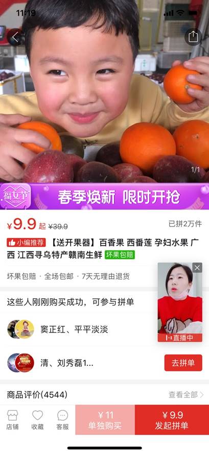 3月4日晚八点,江西寻乌县县长杨永飞走进拼多多和央视新闻直播间,给当地农民黄洪林的店铺当起了“临时主播”,亲自为寻乌百香果代言。半个小时内,拼多多直播间就涌进了超过100万名消费者,央视新闻全网平台也有超过1000万人次观看直播。