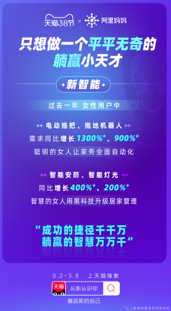 在“新智能”方面,女性再也不是科技黑洞,擅长用智能黑科技来科学管理自己的时间,不仅实现家务全面自动化,还在居家管理上井井有条。其中,电动拖把、拖地机器人等单品,增速均在1000%左右。