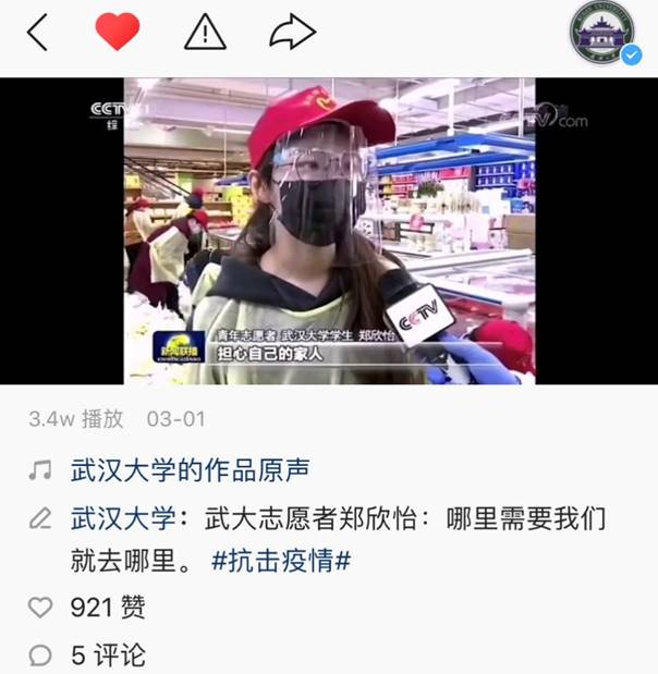 值得一提的是,武汉大学还为抗疫一线输送了许多优秀的医护人员,武大在校学生纷纷加入志愿队伍,贡献自己的力量。武汉大学学生郑欣怡在接受采访时说:“疫情之下,我们大学生应该为所爱的家乡做点事情,去需要我们的地方帮忙。”