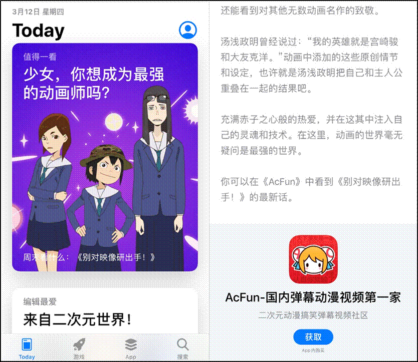 继上周被苹果App Store「今天看什么」栏目推荐后,3月12日,AcFun(即A站)又荣登App Store的C位——Today推荐页。苹果编辑团队还配文《少女,你想成为最强的动画师吗?》,为用户介绍了A站独播新番《别对映像研出手!》的剧情。