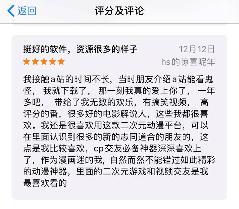 “我接触A站的时间不长,当时朋友介绍……那一刻我真的爱上你了,一年多吧,带给了我无数的欢乐,有搞笑视频,高评分的番,很多好的电影解说人,这些我都很喜欢。很喜欢用这款二次元动漫平台,可以在里面认识到很多新的志同道合的朋友”,一位ACer在App Store的评论区写道。