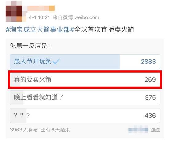 即使4月1日一早,航天科工火箭技术有限公司的专业人士曹梦现身,专门为大家详解了火箭的“选购指南”,但大多数人依然置之一笑。在一场近4000人参与的投票中,2883人认为:这是愚人节玩笑。