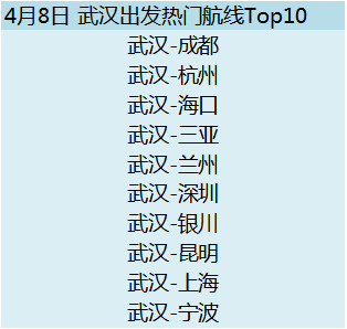 4月8日,武汉-成都航线是去哪儿网平台上武汉出发的最热门航线,其平均价格为944元;武汉-杭州、武汉-海口两条航线是热度排名第二、第三的航线,平均价格分别是782和1190元。