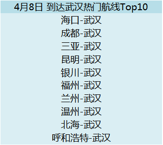 去哪儿网数据显示,8日到达武汉的前三名热门航线中,海口-武汉航线最热门、成都-武汉和三亚-武汉排在第二、三位。此外,到达武汉的热门航线Top10中还有昆明-武汉、银川-武汉、福州-武汉、兰州-武汉、温州-武汉、北海-武汉以及呼和浩特-武汉。
