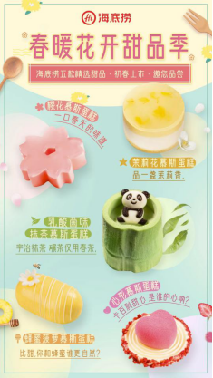 海底捞的甜品则成为它的新亮点,近日以来,抖音、微博等平台上,不乏有博主在安利海底捞甜品。与其他产品相比,颜值、口感俱佳的甜品更容易受到女性消费者喜爱,也愿意为其买单。在此情况下,海底捞将于近日推出的5款精选甜品,大可以成为它的新竞争力所在。