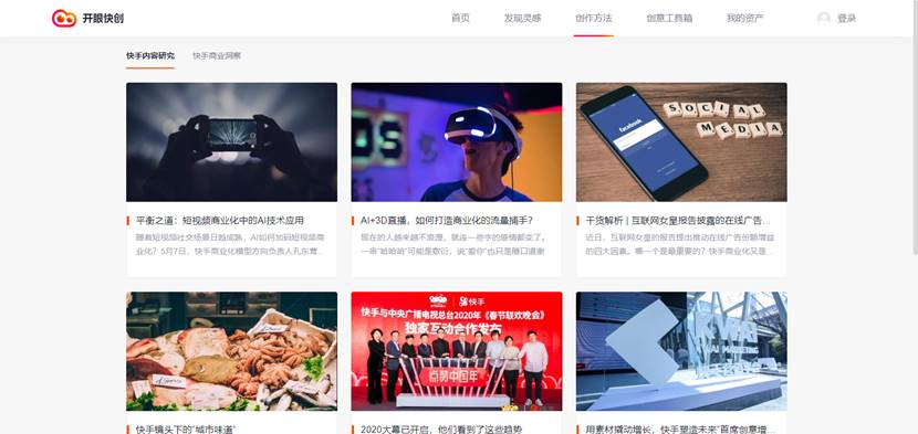此外,“开眼快创”提供体系化学习板块,整理了快手磁力引擎在营销体系、产品技术、内容等方面的进化升级以及行业创意方法论,提供资讯分享、学习课程及研究报告,帮助商业化合作伙伴,了解行业发展一手信息,洞察短视频商业价值,找到创意爆点,快速提升创意能力。