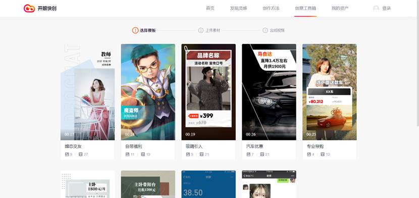 为帮助合作伙伴实现创意的规模化生产和个性化呈现,“开眼快创”提供的创意工具箱可以帮助用户智能制作模板视频和微电影。