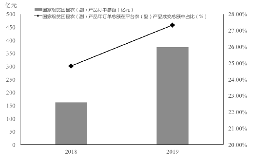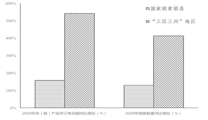 《报告》显示,截至2019年上半年,832个国家级贫困县网络零售额已达到1109.9亿元。2019年,仅在发展最快的农产品上行第一平台拼多多上,商家注册地址位于国家级贫困县的年订单总额高达372.6亿元,“三区三州”年订单总额达47.97亿元,其中绝大部分成交订单为农(副)产品。