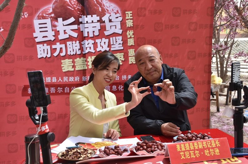 拼多多第一时间推出“市长来直播、农民多卖货”模式。4月9日下午,不久前刚从贫困县序列中退出的新疆喀什地区麦盖提县委副书记、县长艾尼瓦尔·吐尔逊来到拼多多直播间,为当地的特色产品麦盖提灰枣代言,最终吸引了69万拼多多网友的关注,包括麦盖提灰枣在内的麦盖提特产共计销售出约43吨。