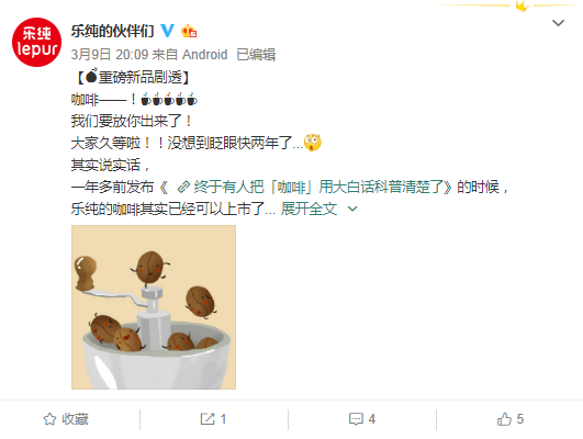 今年3月,乐纯开始在其官方微博“乐纯的伙伴们”发布新品预告,并表示一年多前随着文章的发布乐纯咖啡本可以上市,但出于对乐纯创新精神的尊重,咖啡新品不断迭代,直至现在才面世。