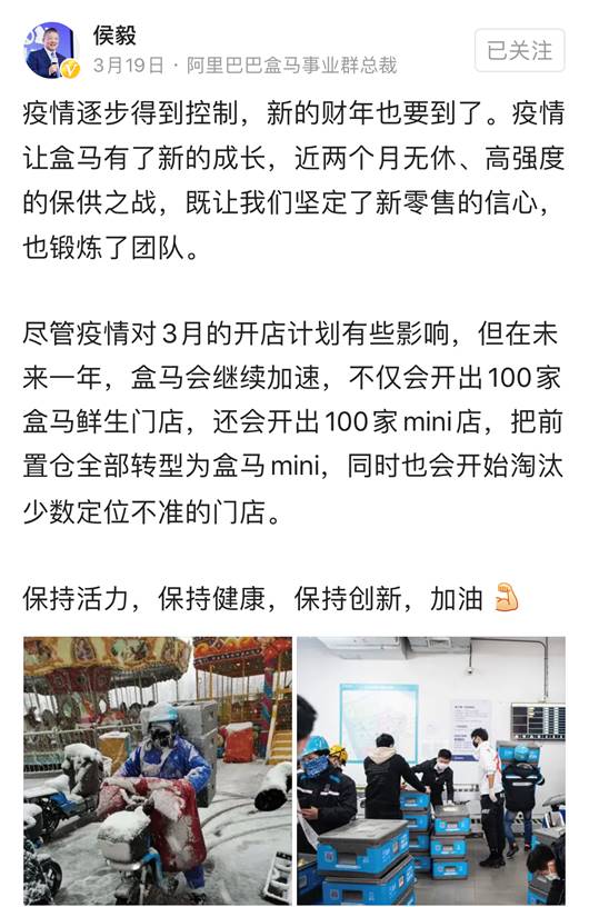 事实上,此前盒马总裁侯毅曾表示过,今年的“双百战略”将新开100家盒马鲜生、100家盒马mini。为了保持健康体魄高速发展,同时也将策略性的淘汰少数定位不准的门店。