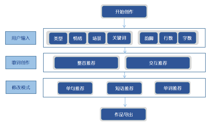 (2)歌词创作:支持AI整首推荐和交互推荐两种创作方式。第一种创作方式“整体推荐”,也是业界常用的创作方式,即根据用户的简单输入,AI直接生成一首完整的歌词返回给用户,这种方式高效,且可有效降低用户创作的门槛。