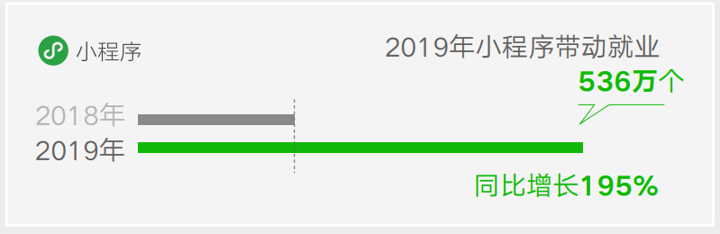 微信作为新生产工具将成为数字化就业的标配——随着微信全平台生态能力的开放,微信小程序、微信支付、企业微信等也将继续深耕产业转型互联的核心需求,为行业用户及合作伙伴提供更有价值的微信产品“工具箱”。其中,小程序更是成为微信带动就业的核心引擎,2019年,小程序日常活跃帐户数超过4亿,加速渗透生活场景,更直接带动就业机会536万个,相比2018年增长195%。
