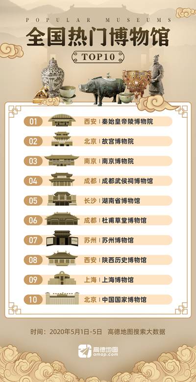 这份最新出炉的博物馆榜单是基于疫情防控阶段后首个五一小长假的出行洞察。数据显示,北京、西安、南京这三个有历史记载的文化古都,均是文化之旅的热门打卡地。在高德地图覆盖的全国近5000家博物馆中,秦始皇帝陵博物院(秦始皇兵马俑博物馆)超过故宫,居全国十大热门博物馆首位,南京博物院位列榜单第三。