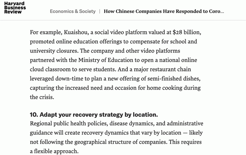 《哈佛商业评论》认为,尽管疫情在一定程度上影响了所有领域,但许多特定领域的需求却在增加,以快手疫情期间上线的“停课不停学”免费学习专区为例,说明中国公司非常善于在危机中发现需求、解决需求。