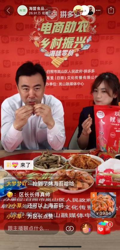 5月20日,山东省日照市岚山区区长牟伟走进拼多多直播间,为当地海产品及深加工产品代言。整场直播吸引了27万网友观看,牟伟成功变身海鲜零食的“风味推荐官”。