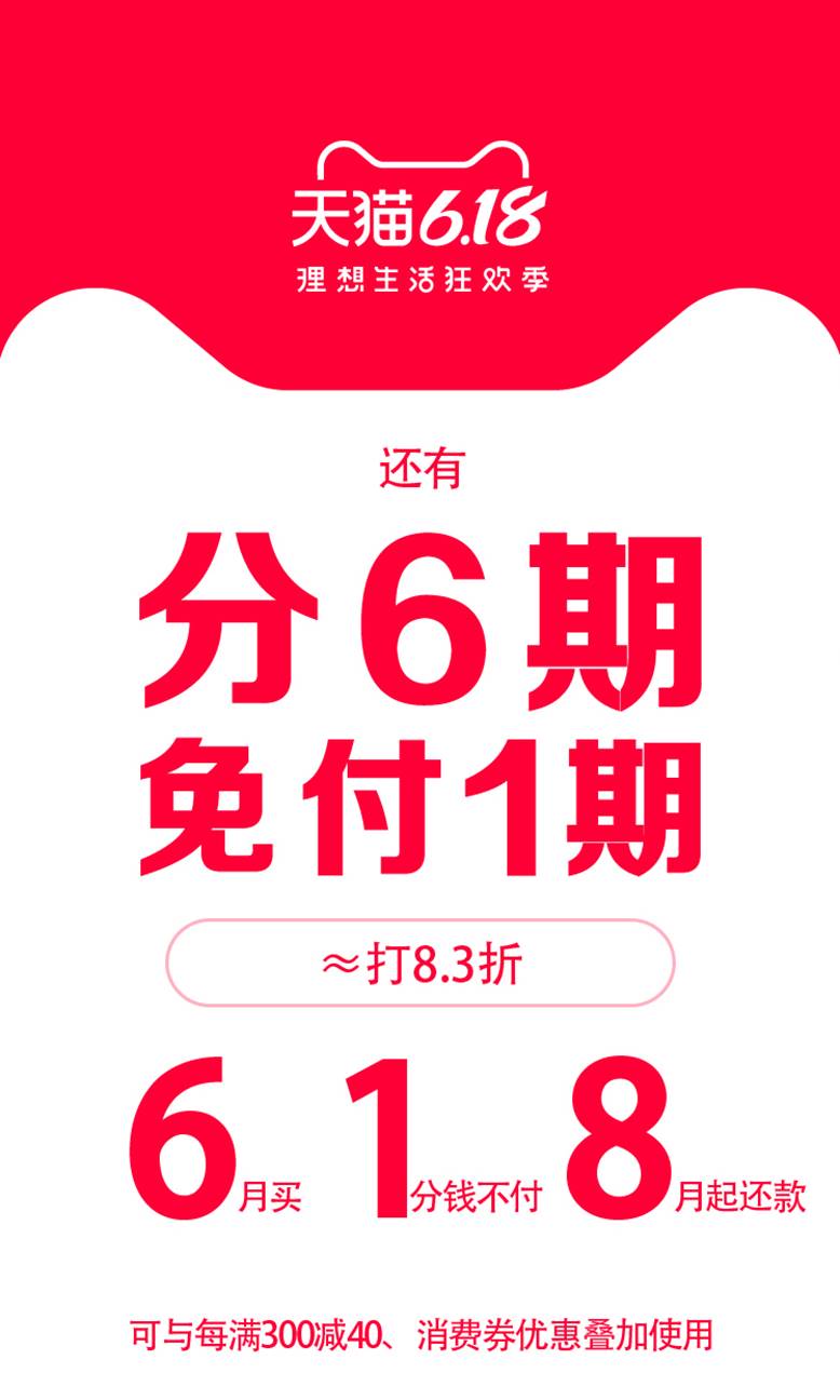 速途网5月30日消息(报道:李楠)今日,天猫618在业内第一个推出“分6期免付1期”服务。参与商品可以分6期还款,首期免付,相当于83折。