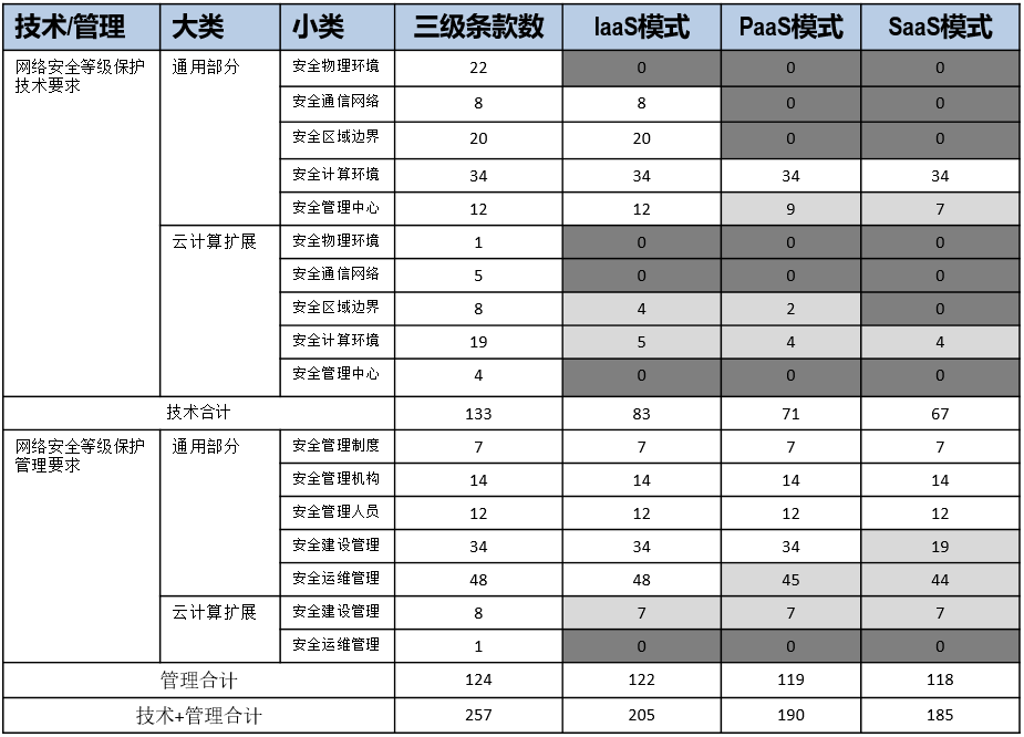 如上图所示,以用户最常过的等保3级为例,白皮书对用户在云上过等保需要关注的条款项进行了详细分类和解读,在IaaS、PaaS、SaaS三种模式下用户要关注的条款项依次减少:IaaS模式下,用户主要关注物理环境以上的工作,需要关注的条款数是自建机房的80%;PaaS模式下,是自建的74%;SaaS模式下,是自建的72%。
