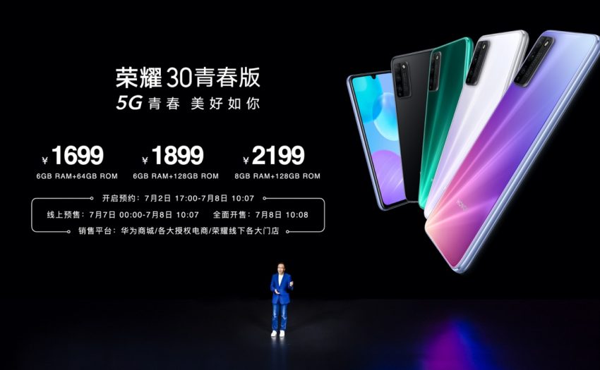 荣耀30青春版共有3个版本,6GB RAM+64GB ROM版本售价1699元,6GB RAM+128GB ROM版本售价1899元,8GB RAM+128GB ROM版本售价2199元;夏日彩虹、幻镜银、绿野仙踪、幻夜黑四种配色。7月8日10:08分将在华为商城、京东、天猫、苏宁易购、唯品会、国美、荣耀亲选等线上线下渠道同步首发开售。