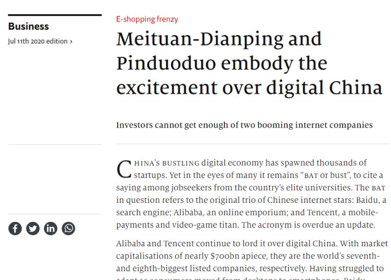 7月11日,全球发行量最大的时政杂志之一英国《经济学人》,发表文章《美团点评和拼多多展现了激动人心的“数字中国”》。