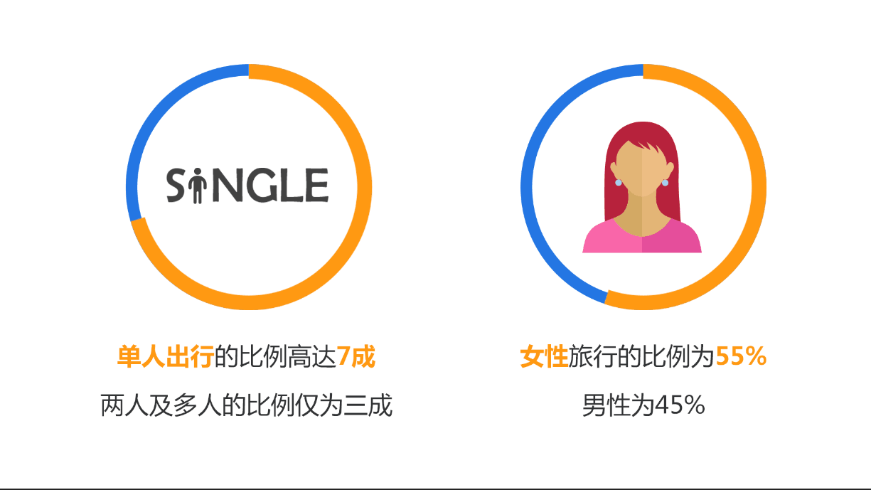 数据显示,综合火车票及机票预订的情况看,单人出行的比例高达7成,两人及多人的比例仅为三成。另外,就单机票预订的情况分析,家庭亲子出行的比例也不足两成,绝大多数为成人订单。