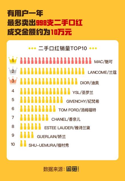 从成交看,闲鱼上闲置口红成交前十大品牌为:魅可、兰蔻、迪奥、圣罗兰、纪梵希、汤姆福特、香奈儿、雅诗兰黛、娇兰、植村秀,为清一色的国际品牌。在国内品牌中,完美日记排名最靠前,为第12位。