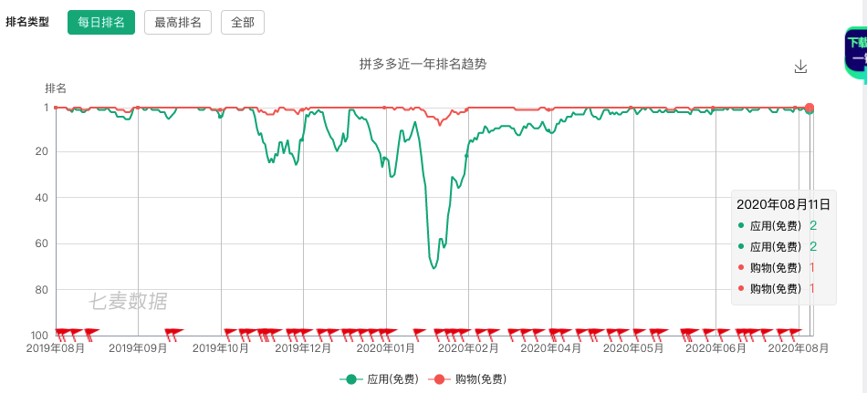 与此同时,国内知名的移动数据分析平台七麦数据也显示,疫情后拼多多苹果应用商店排名持续上升,4月至今一直处于苹果应用商店免费榜与购物榜高位。
