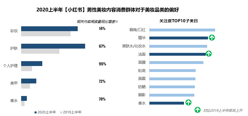 从性别来看,小红书上男性对美妆内容的消费量同比增长46%,25岁左右、在一线和新一线城市的男性是美妆人群主力军。从对内容的偏好来说,男性的偏好以护肤为主,今年上半年对护肤的关注涨幅达67%,而个人护理增速更加明显。一些男士护肤品牌如雅诗兰黛集团的LAB SERIES等也更加关注在小红书的运营。