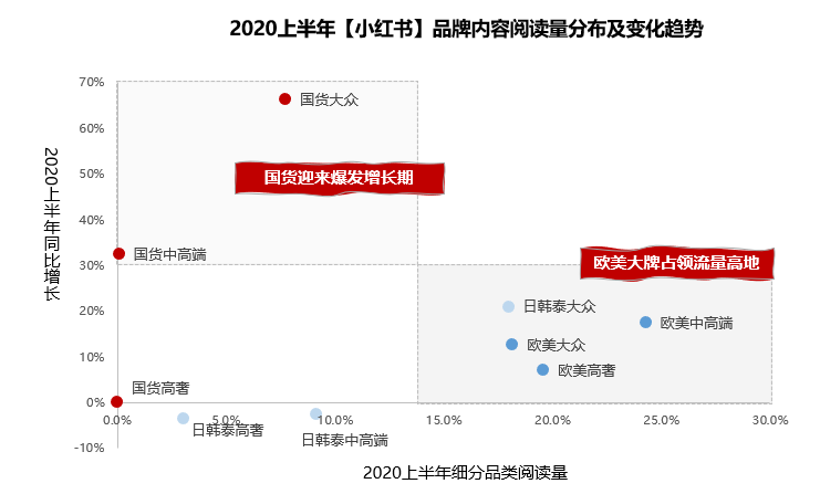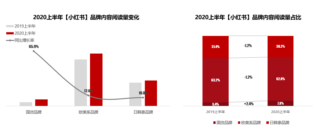 数据显示,在2020年上半年小红书平台上国货品牌内容消费量同比大幅增长65.9%,远超欧美系品牌和日韩泰品牌。从内容总量占比来说,欧美系品牌依然占据绝对优势,但国货品牌内容消费量占比增加明显。