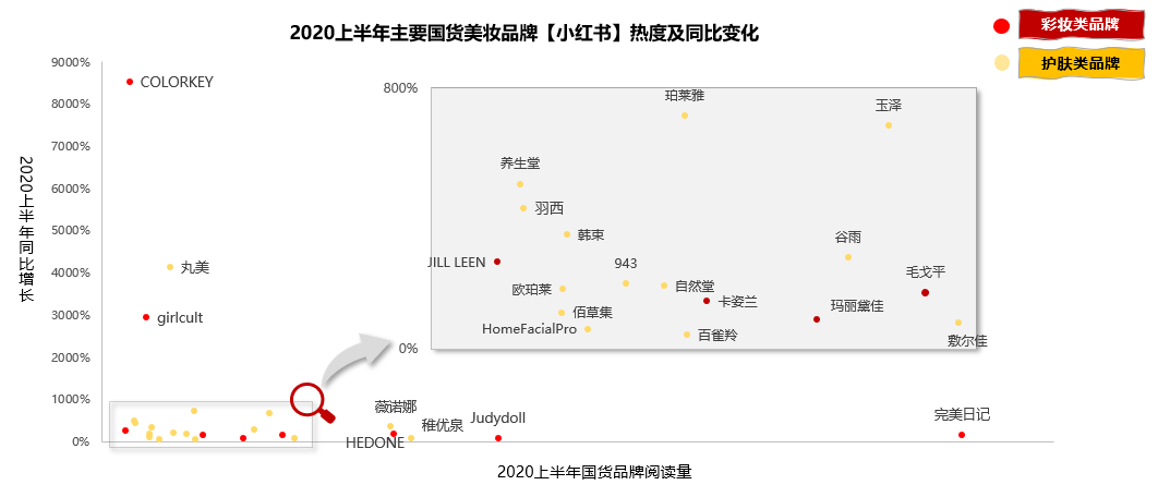 与此同时,整个国货彩妆和护肤市场呈现出竞争激烈、增长迅猛的态势。从内容消费趋势上看,一些新锐国货品牌在2020上半年增势惊人,其中COLORKEY增长超过85倍,Girlcult和丸美增速也分别达到约30倍、40倍。同时,国货品牌在线上营销方面惊喜不断,国货美妆品牌正在摆脱“低廉低质”,打造出了“平价优质”的消费者口碑。