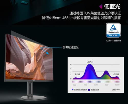 拾光纪SA27D0桌面智慧屏通过低蓝光、无频闪、防眩光、无损GAMMA显示专利技术等多重技术使显示器光线更加柔和、耐看。其中,拾光纪SA27D0桌面智慧屏低蓝光技术已经通过德国TUV莱茵认证,能有效的减少有害蓝光的强度。同时,采用DC调光,减少屏幕闪烁,通过雾化技术优化HAZE参数,将镜面反射转化为类纸面漫反射,并利用无损GAMMA技术,实现暗部细节更清晰、亮部画质不受影响,视觉体验更平衡。