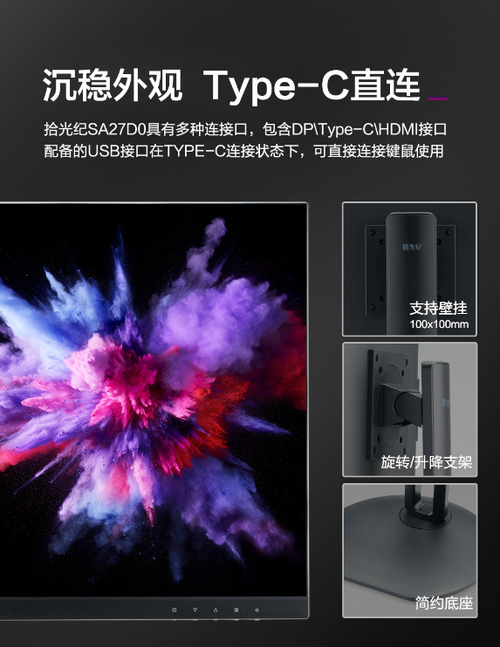 拾光纪SA27D0桌面智慧屏外观沉稳大气,边框极窄,底座简约,既是件商品,也是件艺术品,支持壁挂,可谓宜商务宜家居。值得关注的是,它具有多种拓展接口,包括DP/Type-C/HDMI/USB/Micro USB/耳机等,满足诸多设备接入,配备的USB接口在Type-C连接状态下,可以直接连接键鼠,而且还配备了可以根据坐姿任意调整角度的旋转升降支架,使用起来更加舒适、方便。