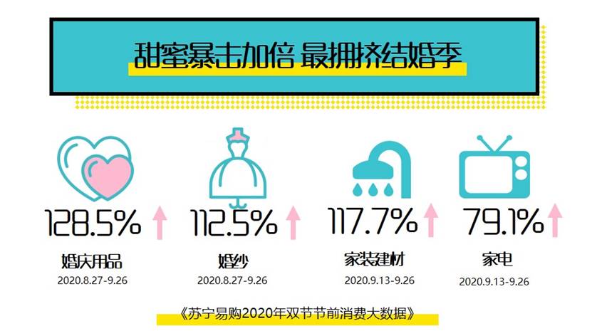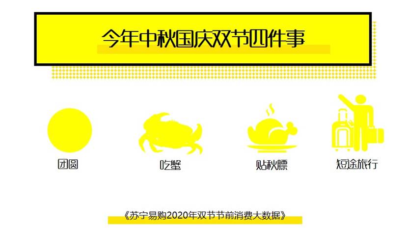 速途网9月27日消息(报道:李楠)今日,苏宁易购发布《苏宁易购2020年中秋国庆节前消费大数据》报告,相较往年,今年国庆结婚、吃螃蟹、团圆、贴秋膘和短途旅行才是消费主旋律。