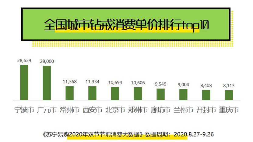 根据《苏宁易购2020年中秋国庆节前消费大数据》报告显示,近一个月(8月27日-9月26日)婚庆用品销量同比增长128.5%,黄金珠宝销量同比增长136.3%。其中,钻戒销量同比增长116.0%,上海市、宁波市、广元市、南京市和苏州市钻戒销量最高。显然,中国的“时尚之都“上海人更相信“钻石恒久远,一颗永流传”。