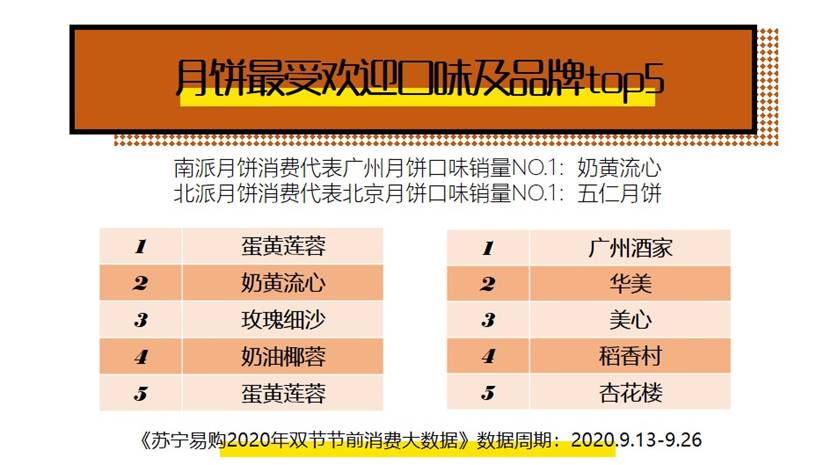 虽然消费者纷纷表示中秋不爱吃月饼,但是月饼仍是送礼主旋律,《苏宁易购2020年中秋国庆节前消费大数据》显示,节前两周月饼销量同比增长215%,蛋黄莲蓉、奶黄流心和玫瑰细沙等广式口味最受欢迎。而五仁月饼和红豆沙、枣泥等传统口味不见踪影,也难怪广州酒家月饼成为品牌销量冠军。